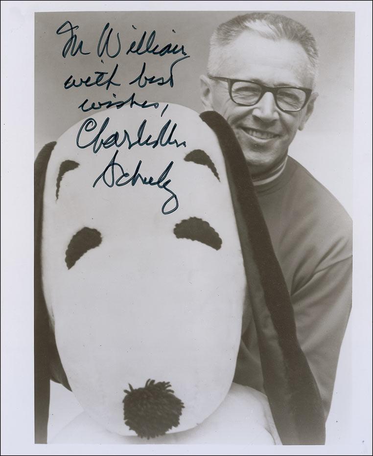 Glossy 8 x 10 photo of Schulz posing with a giant plush Snoopy, signed and inscribed in black felt tip “For William, with best wishes, Charles M. Schulz.” In fine condition.