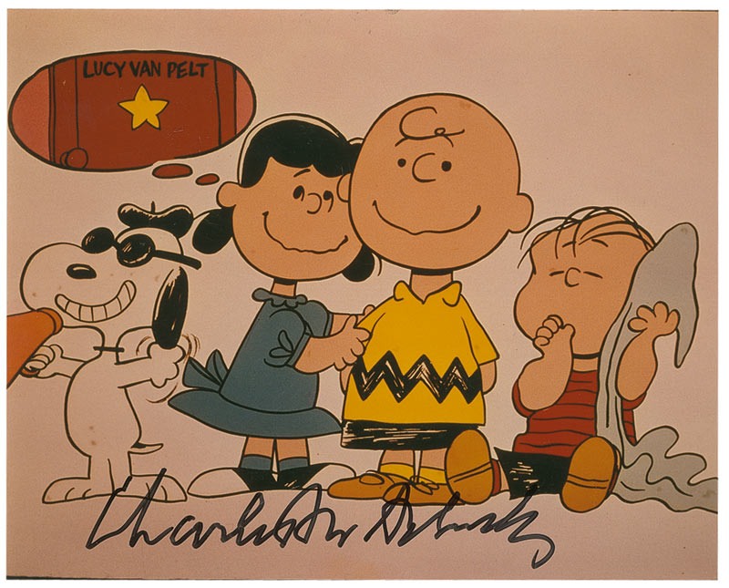 Color glossy 10 x 8 photo of four Peanuts characters, signed in black felt tip. In fine condition, with light staining and surface impressions.
