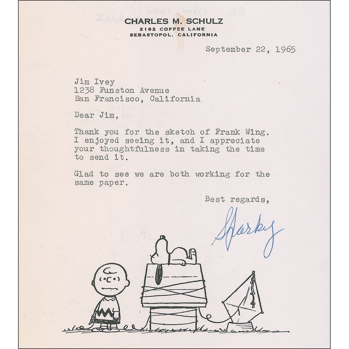 TLS signed “Sparky,” one page, 6.25 x 7, personal notepaper bearing a printed Charlie Brown cartoon, September 22, 1965. Letter of thanks to a colleague. In full: “Thank you for the sketch of Frank Wing. I enjoyed seeing it, and I appreciate your thoughtfulness in taking the time to send it. Glad to see we are both working for the same paper.” In fine condition, with a small spot of toning to top.