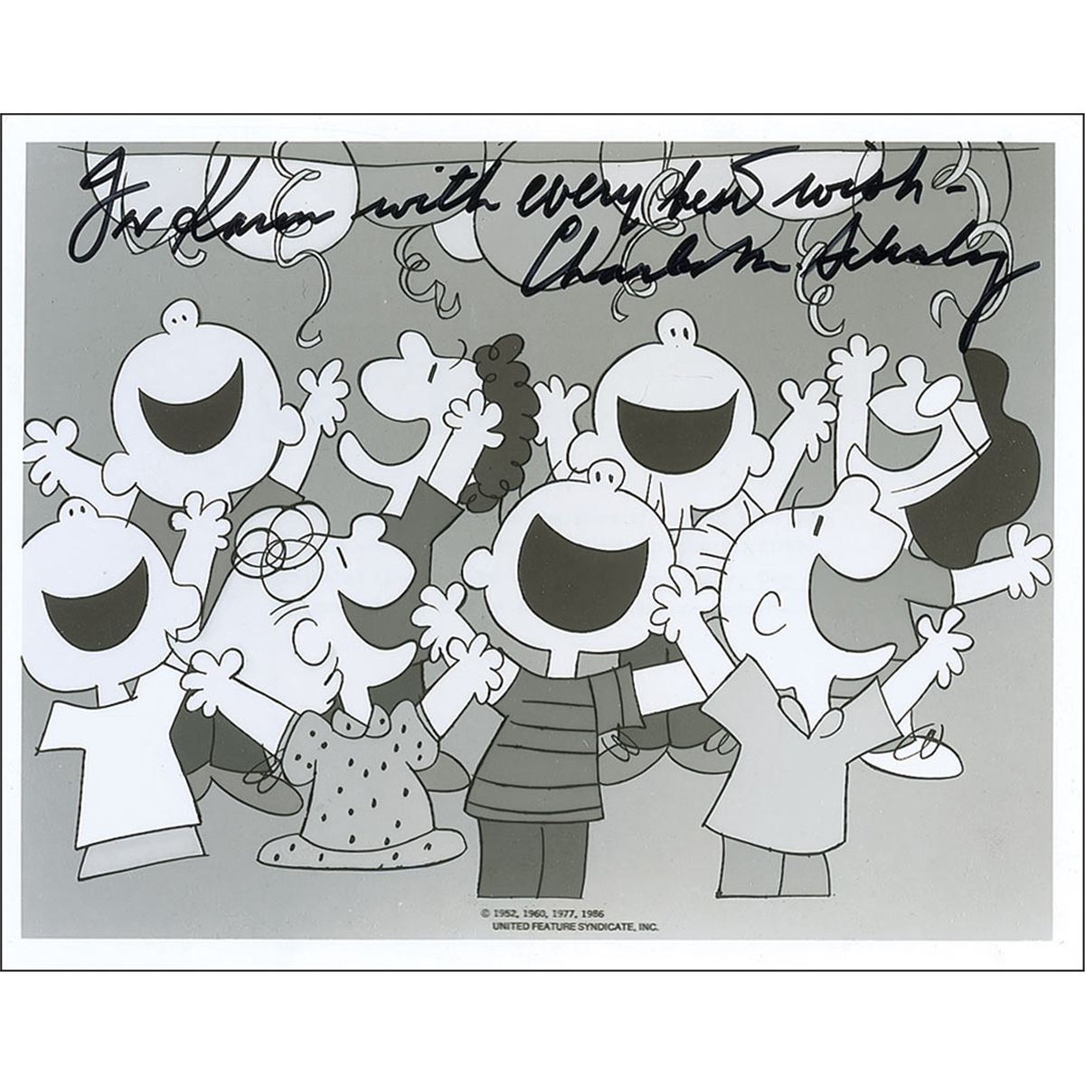Glossy 9 x 7 CBS promotional photo for Happy New Year Charlie Brown, signed and inscribed in black felt tip ”For Karen, with every good wish—Charles M. Schulz.” In fine condition, with original promotional information affixed to reverse.