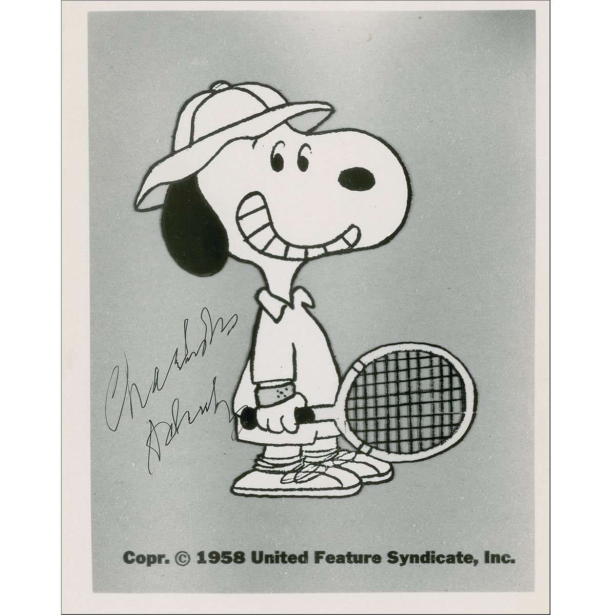 Glossy 7 x 9 photo of Snoopy dressed for tennis, signed in black ink, “Charles M. Schulz.” In fine condition, with a few scattered light surface marks and dings.