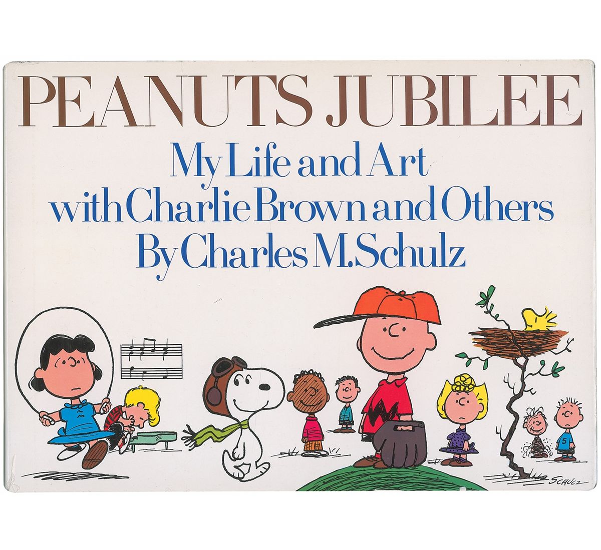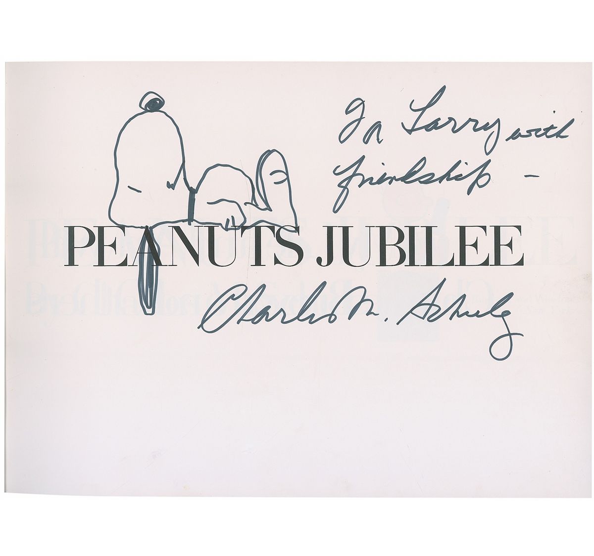 Signed book: Peanuts Jubilee. First edition. NY: Holt, Rinehart and Winston, 1975. Hardcover with dustjacket, 15.5 x 11.25, 222 pages. Signed and inscribed in black felt tip on the half-title page, “For Larry with friendship—Charles M. Schulz,” with Schulz adding a great full-length sketch of Snoopy lying atop the book’s title. Book condition: VG/VG. Silver paper-covered boards; moderate edgewear and light rubbing; corners and spine-ends bumped (not affecting textblock); several tiny tears in paper over interior hinges from binding staples (cosmetic flaw only, binding not weakened). Dust jacket has several small tears and creases along edges and minor rubbing/soiling. A great rendition of Schulz’s most famous character.