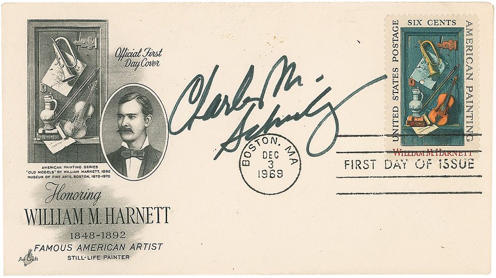 FDC with a cachet honoring American artist William M. Harnett, signed in black felt tip, “Charles M. Schulz.” In fine condition.