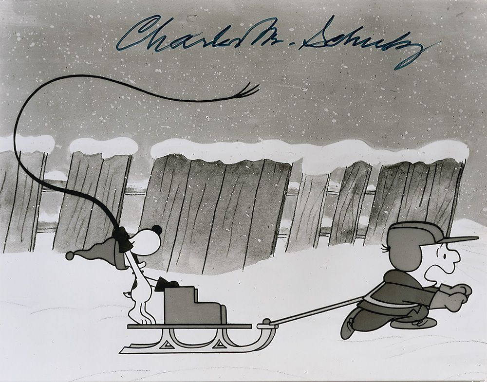 Glossy 9 x 7 CBS promotional photo for What a Nightmare, Charlie Brown, signed in black felt tip, “Charles M. Schulz.” A promotional caption is affixed to the reverse. In fine condition, with a few scattered creases and surface marks.
