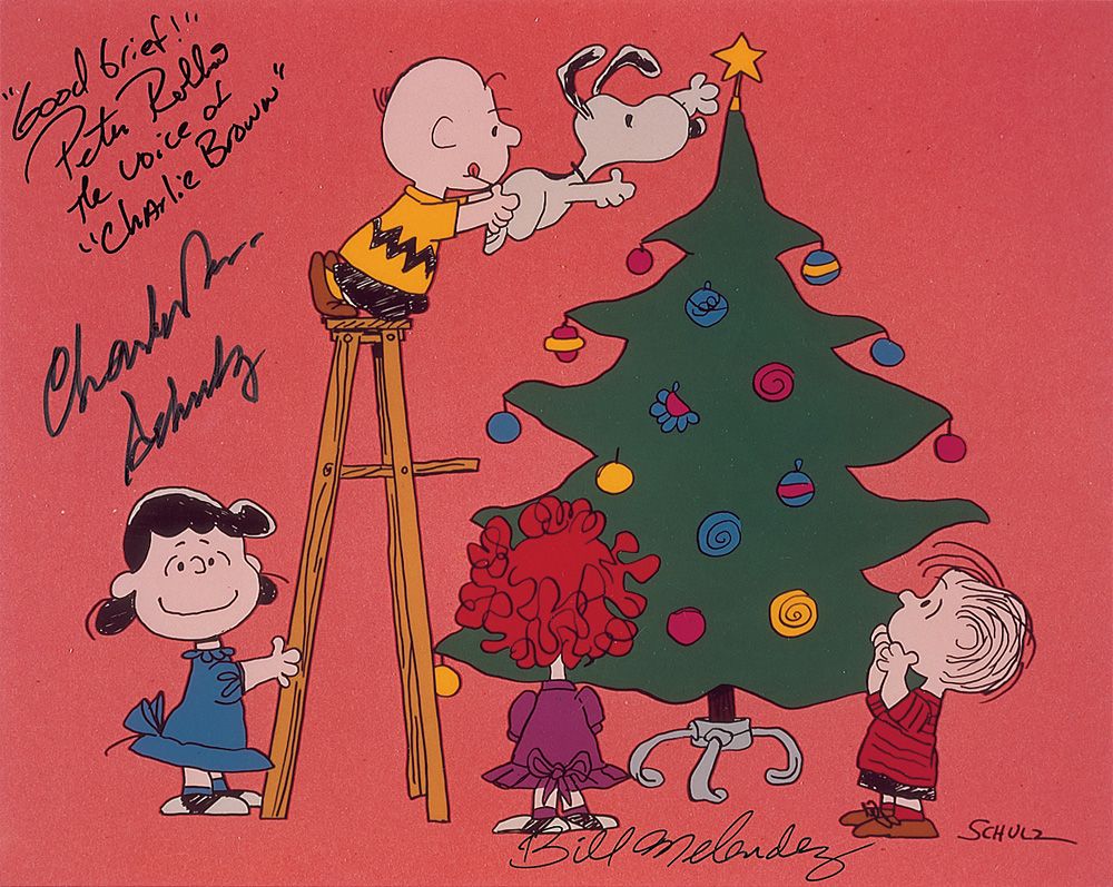 Color glossy 10 x 8 photo of the Peanuts gang trimming a Christmas tree, signed in black felt tip by Schulz and also signed by Peter Robbins, the voice of Charlie Brown. In fine condition.