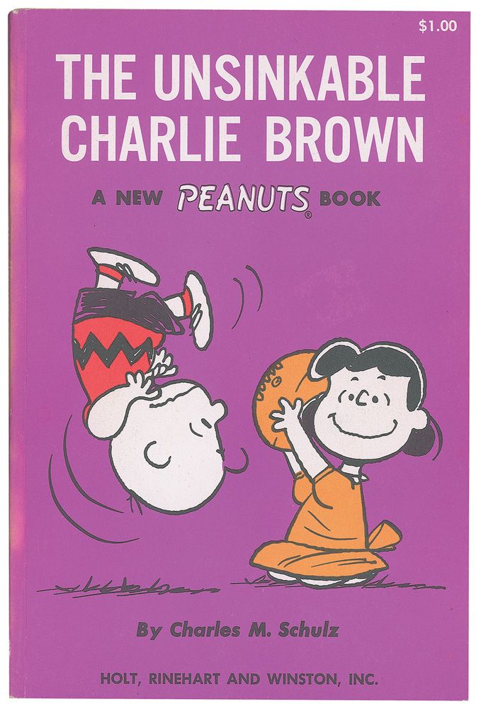 Signed book: The Unsinkable Charlie Brown. First edition. NY: Holt, Rinehart, and Winston, 1966. Paperback, 5.25 x 8. Signed and inscribed in green felt tip on the half-title page, “For the Hales with friendship—Charlie Schulz.” Opposite the signature, on the inside front cover, Schulz has added a fabulous full-length sketch of Snoopy sitting in the grass, signed underneath the image, “Schulz.” Autographic condition: fine. Book condition: VG+/None. Purple illustrated wraps; spine sunned; light foxing to textblock edges; very light abrasion to front, likely from gently removed sticker.