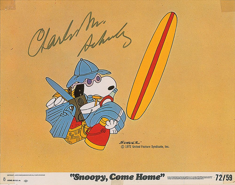 Color 10 x 8 cardstock promotional photo for the 1972 cartoon Snoopy, Come Home, prominently signed in black felt tip, “Charles M. Schulz.” Tape remnants to corners and lower border which could be easily matted out, otherwise fine condition.