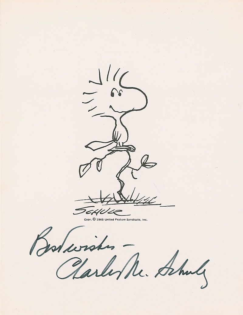 Printed sketch of Woodstock on an off-white 8.5 x 11 sheet, prominently signed at the bottom in black felt tip, “Best Wishes—Charles M. Schulz.” In fine condition, with slight scattered wrinkling.