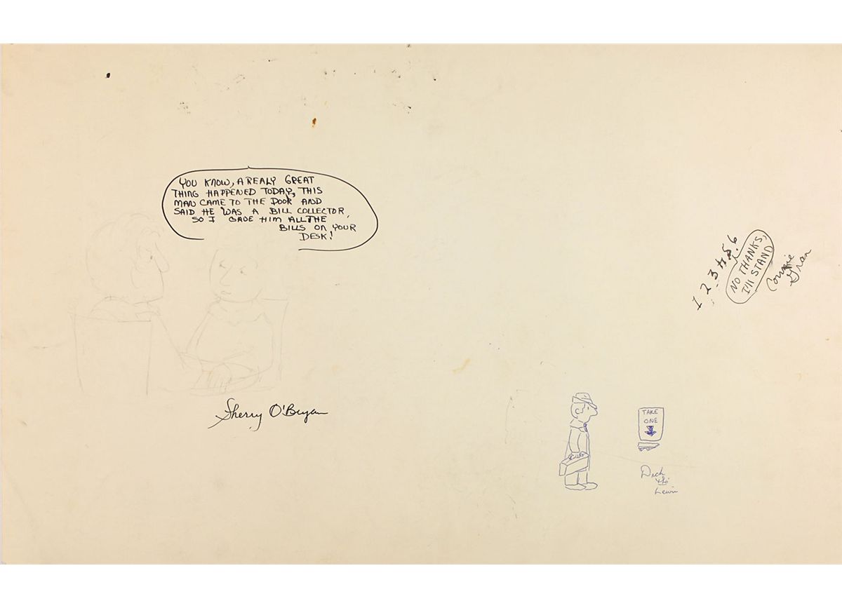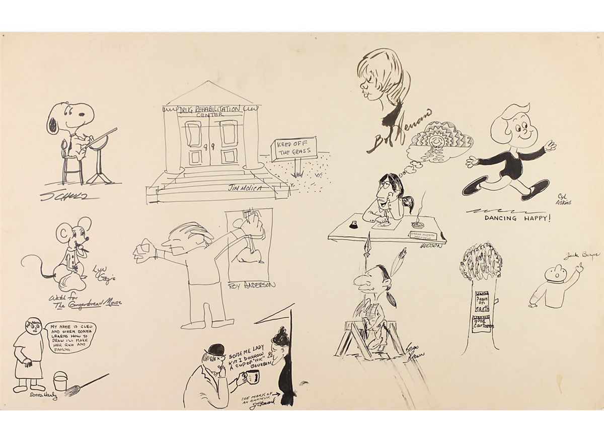 Original signed felt tip sketch of Snoopy sitting at a school desk on an off-white 23 x 14.5 sheet of artist’s cardstock, and also bearing 10 other sketches by cartoonists including Cyl Askins, Brian Brown, Roy Andersen, Lyn Gagis, and Jim Molica. In fine condition, with some light pencil remnants along top edge and some mild soiling.