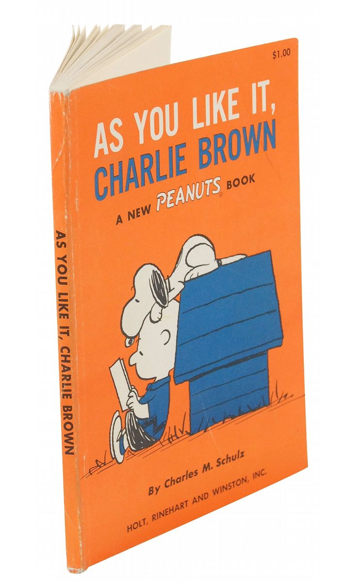 Signed book: As You Like It, Charlie Brown. Later printing. NY: Holt, Rinehart and Winston, 1964. Softcover, 5.25 x 8. Signed on the inside front cover in brown felt tip by Schulz, who adds an adorable full-length sketch of Snoopy. Autographic condition: fine. Book condition: VG+/None.