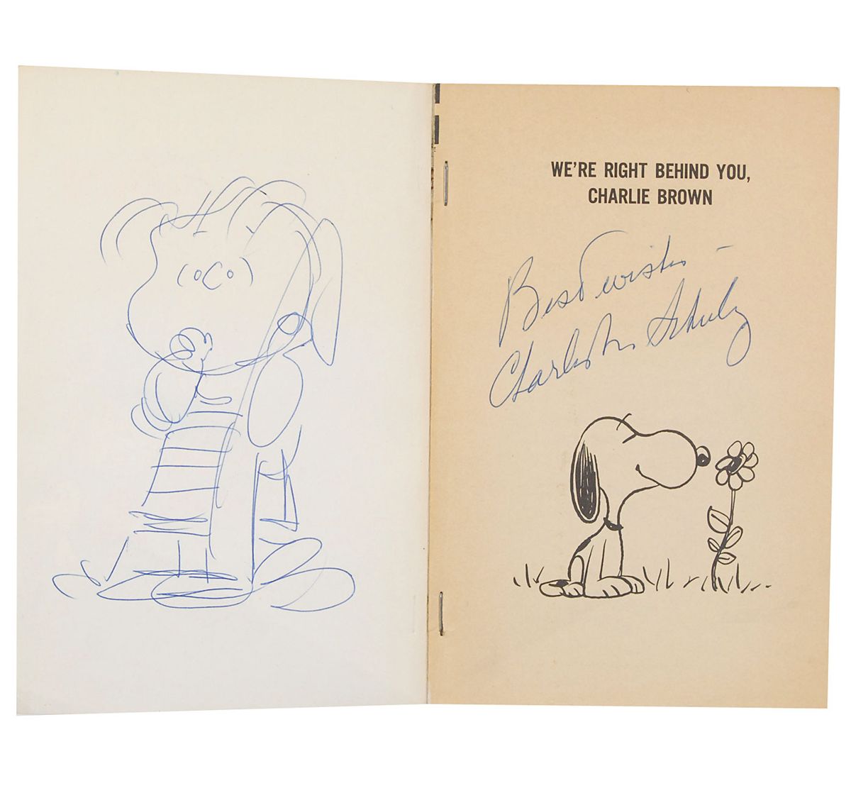 Signed book: We’re Right Behind You, Charlie Brown. First edition. NY: Holt, Rinehart & Winston, 1964. Softcover, 5.25 x 8. Signed on the half-title page in blue ballpoint, “Best wishes, Charles M. Schulz,” with Schulz adding a terrific full-length sketch of Linus inside the front cover. Autographic condition: fine. Book condition: VG/None.
