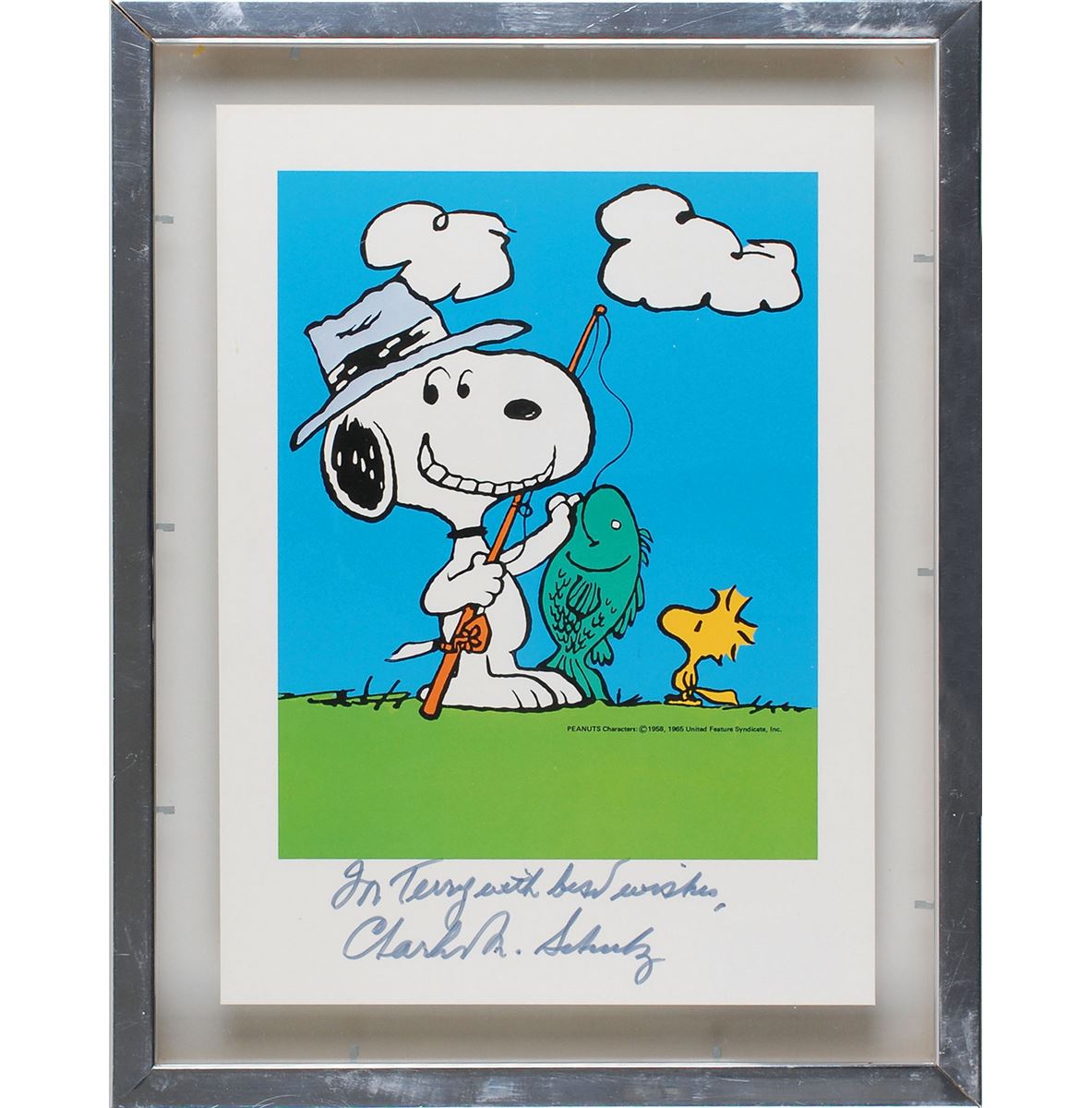 Color 10 x 14 print of Snoopy and Woodstock fishing, designed and printed exclusively for the Zebco fishing equipment company in 1980, signed and inscribed in the lower border in black felt tip, “For Terry, with best wishes, Charles M. Schulz.” Framed to an overall size of 13 x 17. In fine condition.