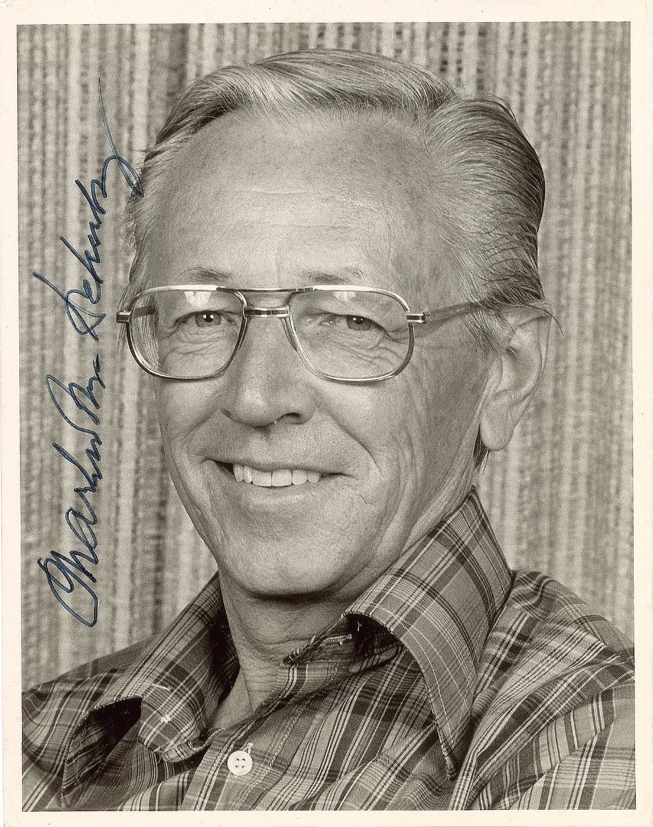 Glossy 7 x 9 close-up photo of the acclaimed cartoonist, signed vertically in black felt tip, “Charles M. Schulz.” Reverse bears two affixed CBS captions promoting the televised premiere of ‘Happy Birthday, Charlie Brown’ on January 5, 1979. In fine condition.