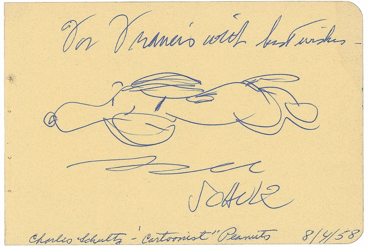 Excellent vintage ballpoint sketch of Snoopy bounding through the air on a beige 5.75 x 4 album page, signed and inscribed, “For Francis with best wishes—Schulz.” A collector’s notation dates the sketch to August 4, 1958. In fine condition.