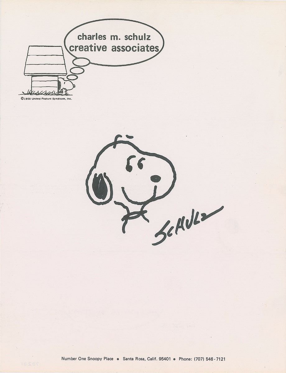 Bold felt tip sketch of Snoopy on a 8.5 x 11 sheet of Charles M. Schulz Creative Associates, signed “Schulz.” In fine condition.