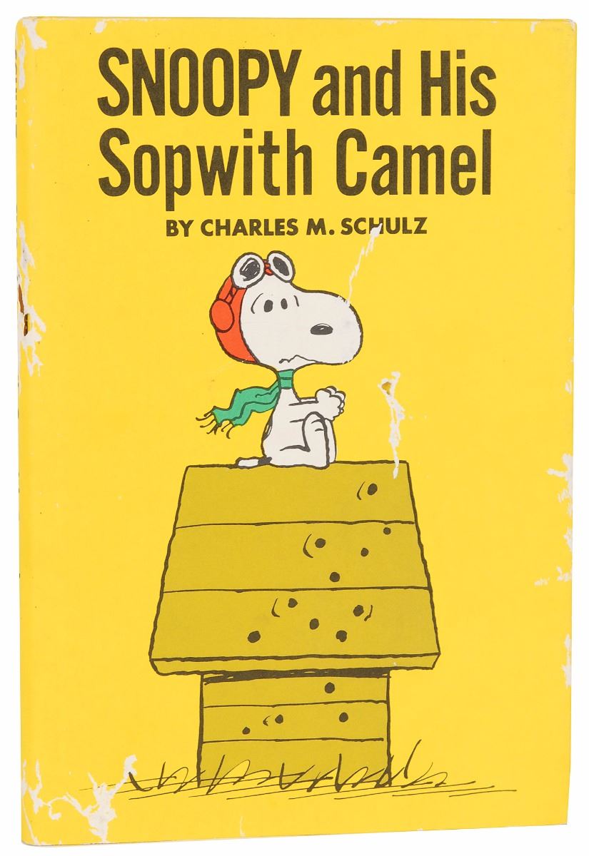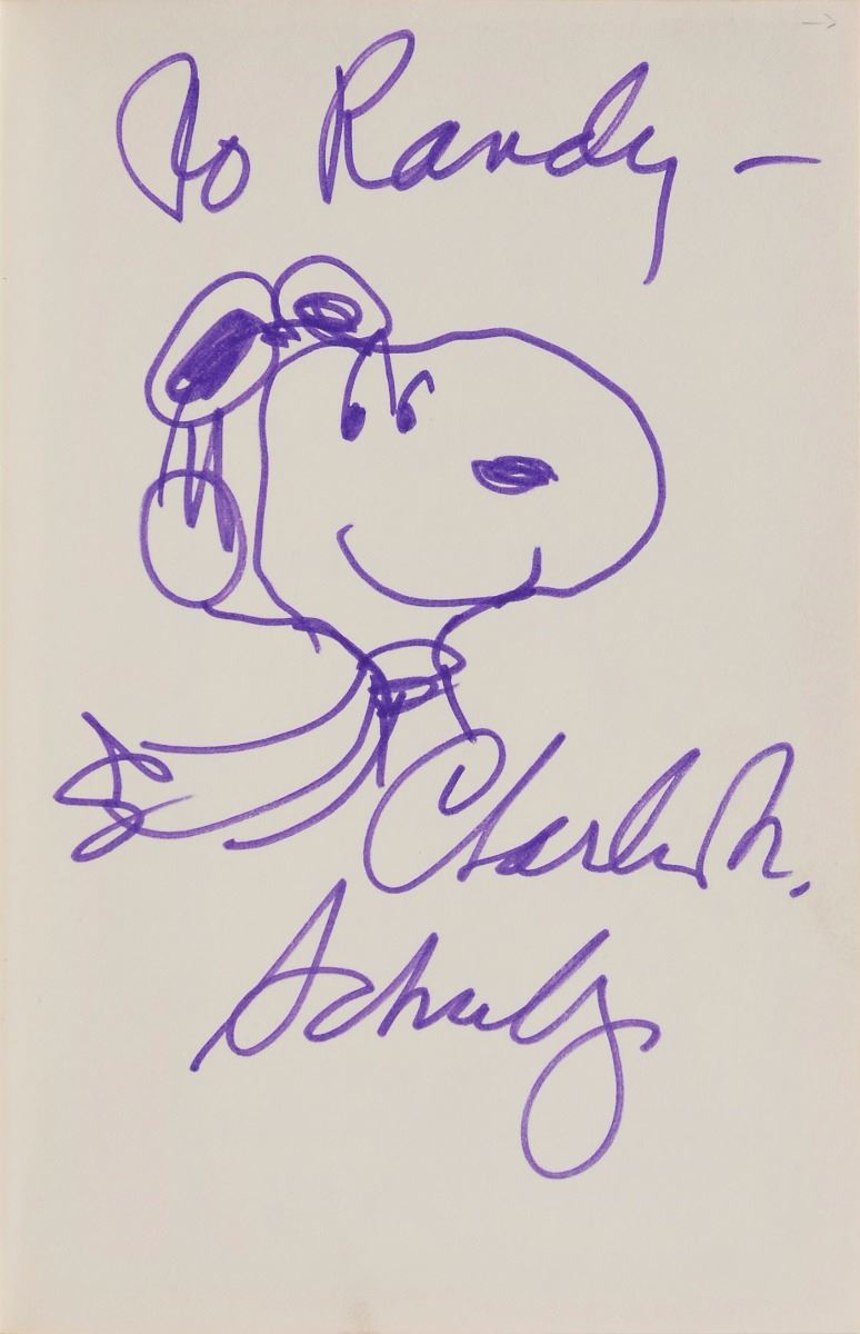 Signed book: Snoopy and His Sopwith Camel. First edition. NY: Holt, Rinehart and Winston, 1969. Hardcover with dust jacket, 5.5 x 8.25, 64 pages. Signed and inscribed on the first free end page in purple felt tip, “To Randy—Charles M. Schulz,” adding a wonderful sketch of Snoopy wearing aviator goggles. In fine condition, with scattered small areas of paper loss to the dust jacket.