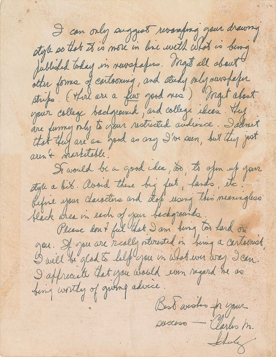 ALS signed “Charles M. Schulz,” one page, 8.5 x 11, no date. Letter to a budding cartoonist. In part: “I can only suggest revamping your drawing style so that it is more in line with what is being published today in newspapers. Forget all about other forms of cartooning, and study only newspaper strips. (There are a few good ones). Forget about your college background, and college ideas. They are funny only to your restricted audience. I admit that they are as good as any I’ve seen, but they just aren’t marketable. It would be a good idea, too, to open up your style a bit. Avoid these big feet, hands, etc. Refine your character and stop using this meaningless black area in each of your backgrounds…If you are really interested in being a cartoonist, I will be glad to help you in what ever way I can.” In very good condition, with overall staining from old adhesive residue on the reverse.