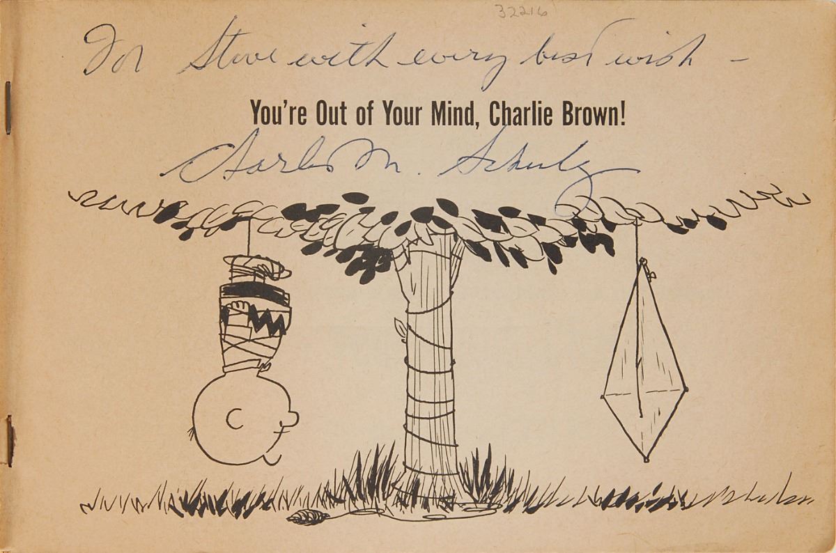 Signed book: You’re Out of Your Mind, Charlie Brown! First edition. NY: Rinehart & Co., 1959. Softcover, 8 x 5.25. Signed and inscribed on the title page in blue ballpoint, “To Steve, with every best wish—Charles M. Schulz.” In very good condition, with a heavy crease to the front cover, ballpoint line drawn on Charlie Brown’s face on the cover image, and uniform overall toning.