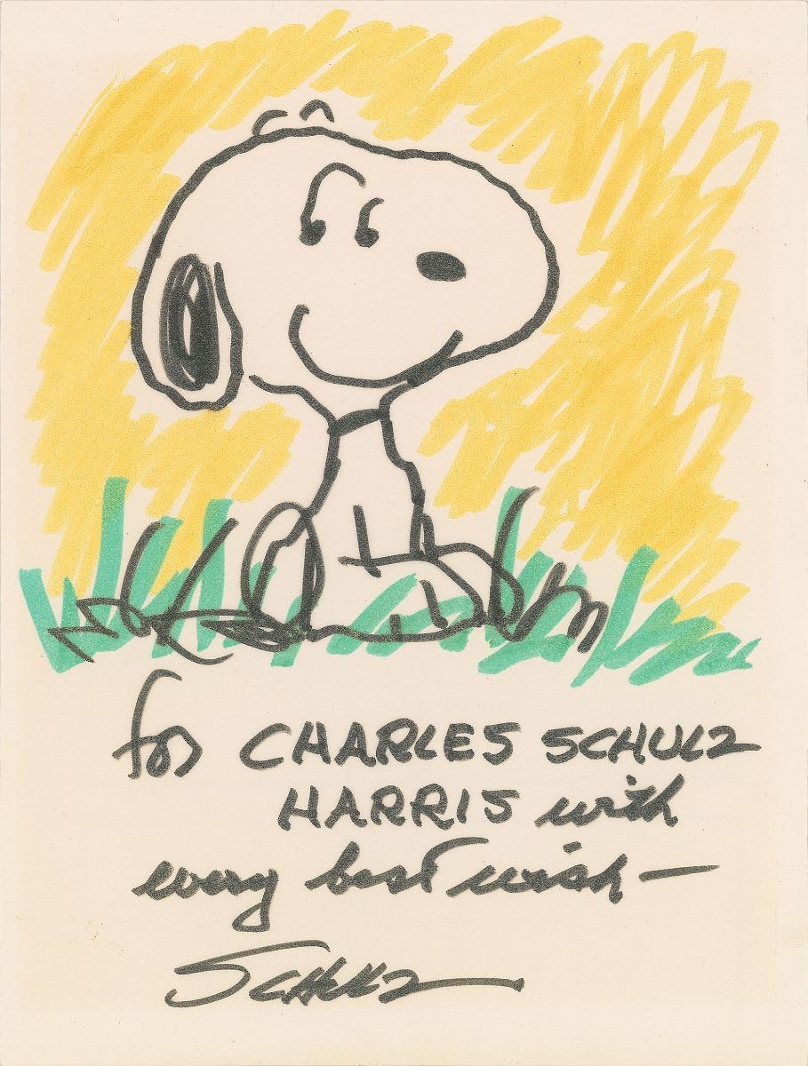 Colorful original felt tip sketch of Snoopy sitting on grass against a sunny backdrop on the reverse of an 8 x 10.5 Peanuts storyboard sheet, signed and inscribed below in black felt tip, "For Charles Schulz Harris with every best wish—Schulz." In fine condition. With the unusual inscription of a second full signature, this is a lovely multicolored Snoopy sketch, and an example not commonly seen. Pre-certified PSA/DNA.