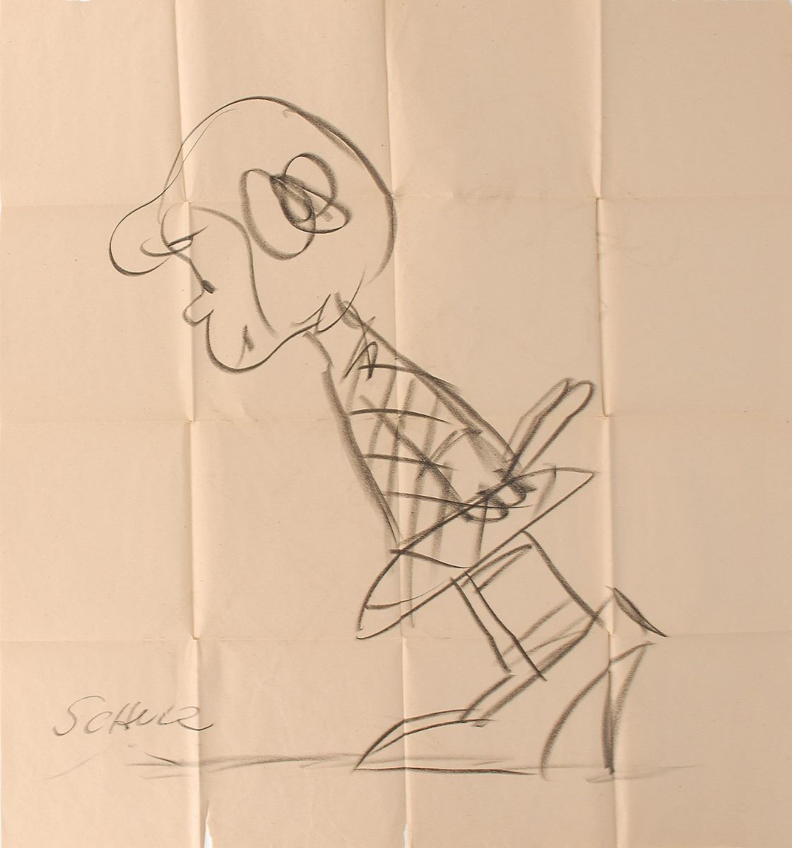 Huge original signed black crayon sketch of Patty Swanson wearing a large pair of heels on a beige 32 x 35 sheet, signed in the lower left, Schulz." In very good to fine condition, with tears along fold edges and small holes at fold intersections. A uniquely massive sketch from the Peanuts creator, made all the more uncommon by the presence of Patty, who was featured in the very first Peanuts comic strip on October 2, 1950. Pre-certified PSA/DNA.