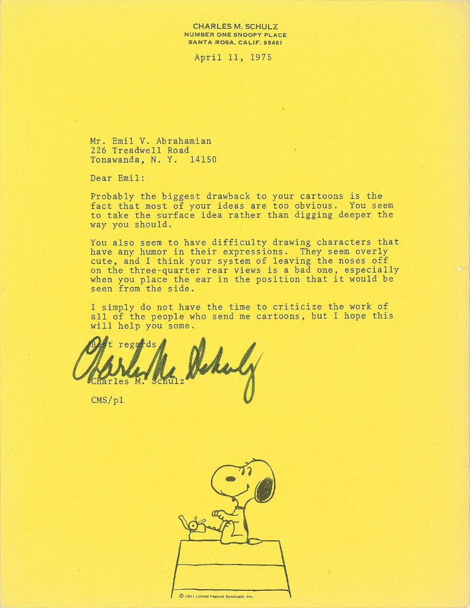 TLS signed “Charles M. Schulz,” one page, 8.5 x 11, personal letterhead, April 11, 1975. Letter to fellow cartoonist Emil V. Abrahamian, in full: “Probably the biggest drawback to your cartoons is the fact that most of your ideas are too obvious. You seem to take the surface idea rather than digging deeper the way you should. You also seem to have difficulty drawing characters that have any humor in their expressions. They seem overly cute, and I think your system of leaving the noses off on the three-quarter rear views is a bad one, especially when you place the ear in the position that it would be seen from the side. I simply do not have the time to criticize the work of all the people who send me cartoons, but I hope this will help you some.” Includes an original one panel comic strip for "Impressions," 7.75 x 9, signed in the lower right by Abrahamian, and depicting a child seated at a desk and writing a letter, which reads: “Dear Mr. President, Please reduce the national debt and lower taxes so daddy can raise my allowance.” In fine condition, with light creasing to the letter. Pre-certified PSA/DNA.