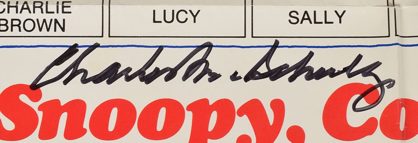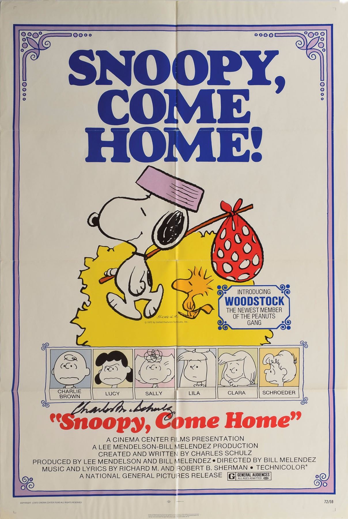 Color 27 x 41 one-sheet movie poster for the 1972 animated film Snoopy, Come Home, signed in black felt tip, "Charles M. Schulz." In fine, folded condition, with minor paper loss at fold intersections.