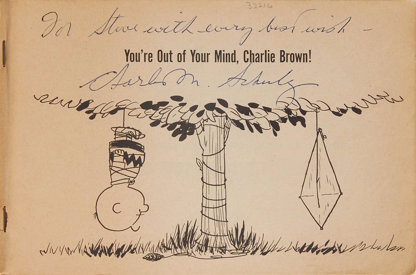 Signed book: You're Out of Your Mind, Charlie Brown! First edition. NY: Rinehart & Co., 1959. Softcover, 8 x 5.25. Signed and inscribed on the title page in blue ballpoint, "To Steve, with every best wish-Charles M. Schulz." In very good condition, with a heavy crease to the front cover, ballpoint line drawn on Charlie Brown's face on the cover image, and uniform overall toning.