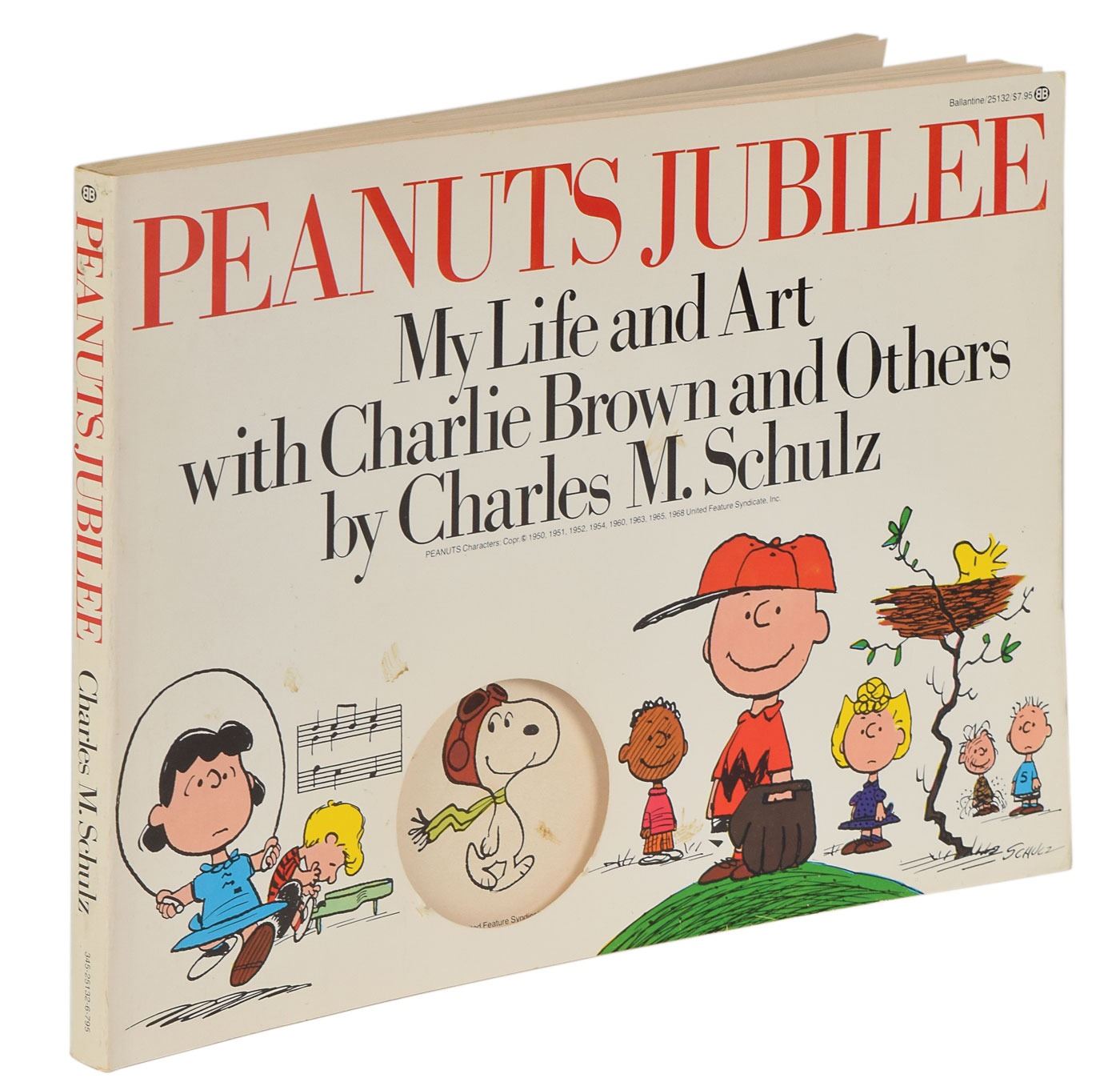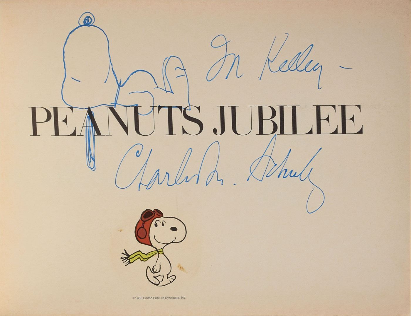 Signed book: Peanuts Jubilee. Second printing. NY: Ballantine Books, 1976. Softcover, 10.75 x 8, 223 pages. Prominently signed and inscribed on the title page in blue felt tip, "For Kelley—Charles M. Schulz," with the addition of a wonderful large original sketch of Snoopy reclining on the first word of the title. In fine condition, with a bit of soiling to the front cover.