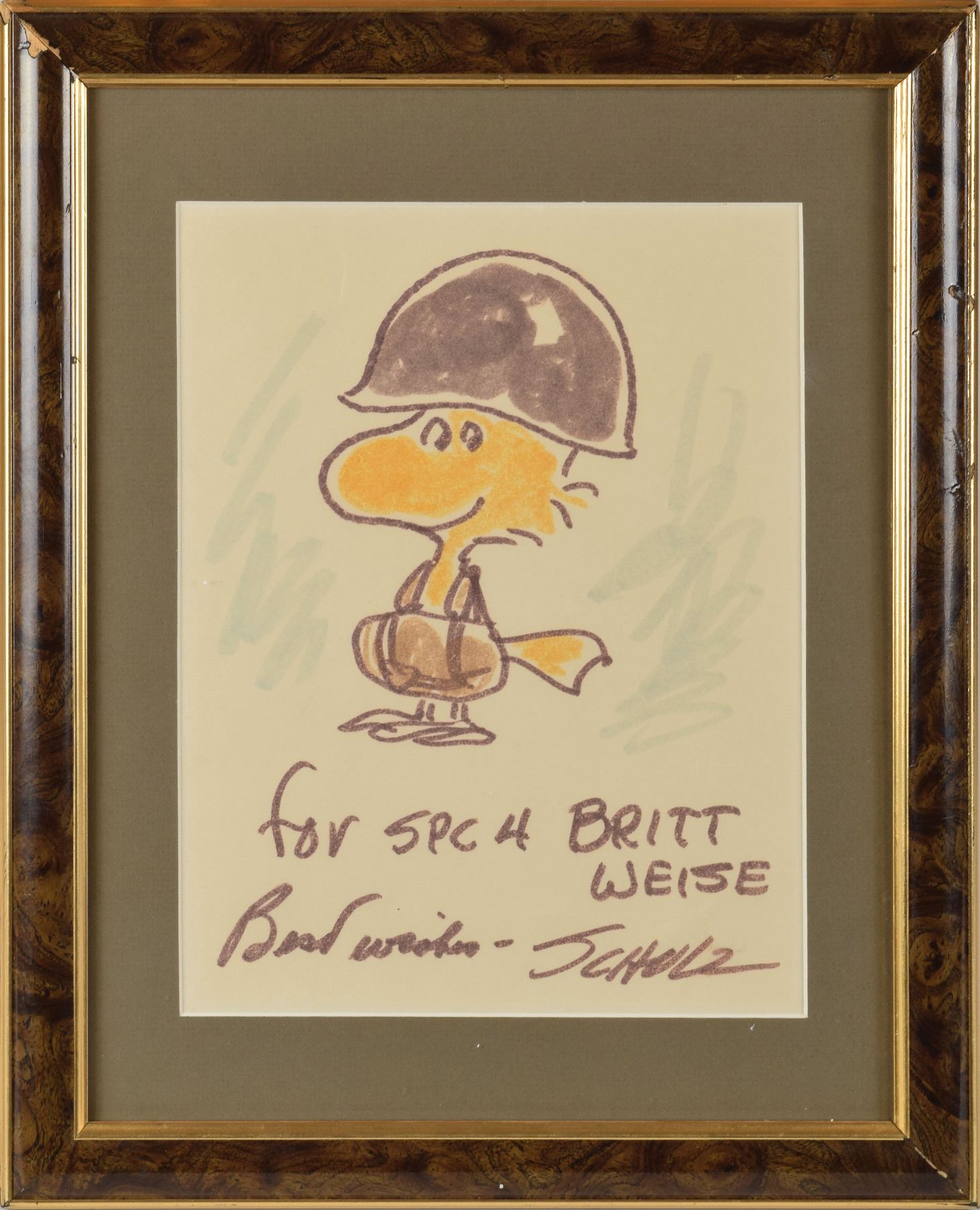 Original felt tip sketch of Woodstock smiling and dressed as a soldier on an off-white 8.25 x 10.75 sheet, signed and inscribed in black felt tip, "For SPC 4 Britt Weise, best wishes—Schulz." Matted and framed to an overall size of 13 x 16. In fine condition. Schulz sketches of Woodstock, the feathered best friend of Snoopy, remain very scarce and highly sought after.
