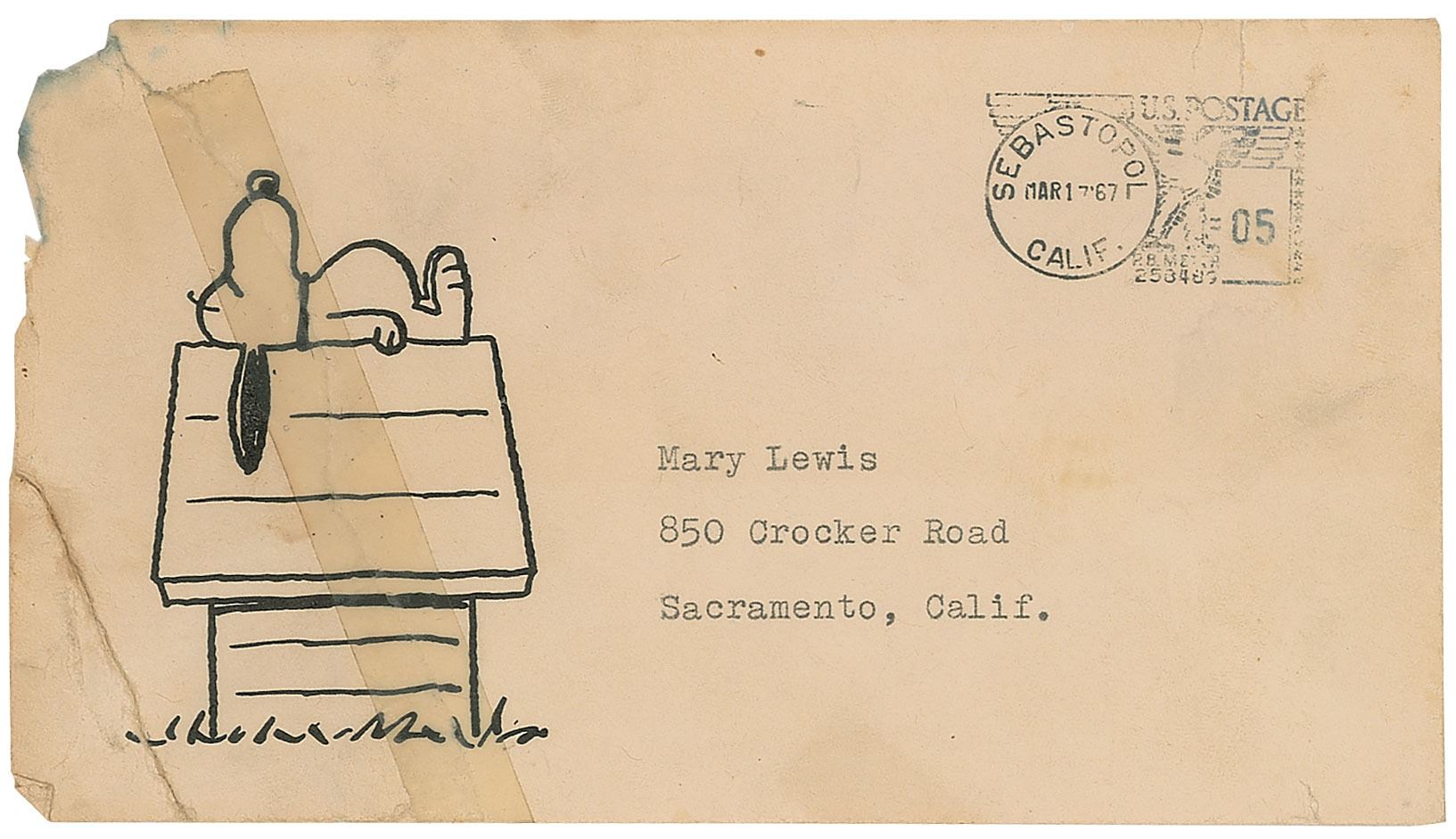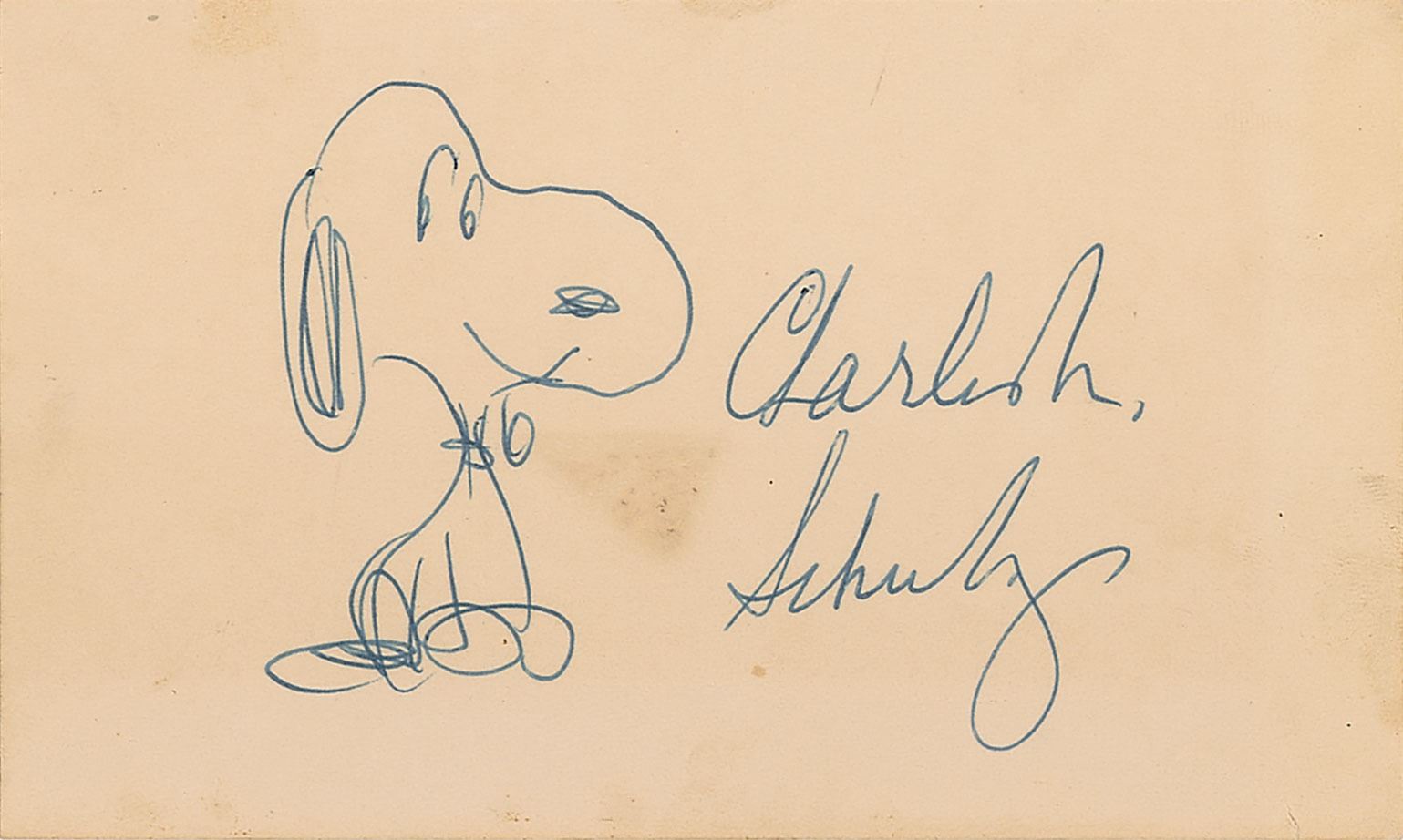 Fabulous original vintage ballpoint sketch of a seated Snoopy on an off-white 5 x 3 card, signed on the right side, "Charles M. Schulz." In fine condition, with a light triangular stain to the center from old tape residue on the reverse. Accompanied by the original mailing envelope, bearing a printed Snoopy image, postmarked in March 1967.