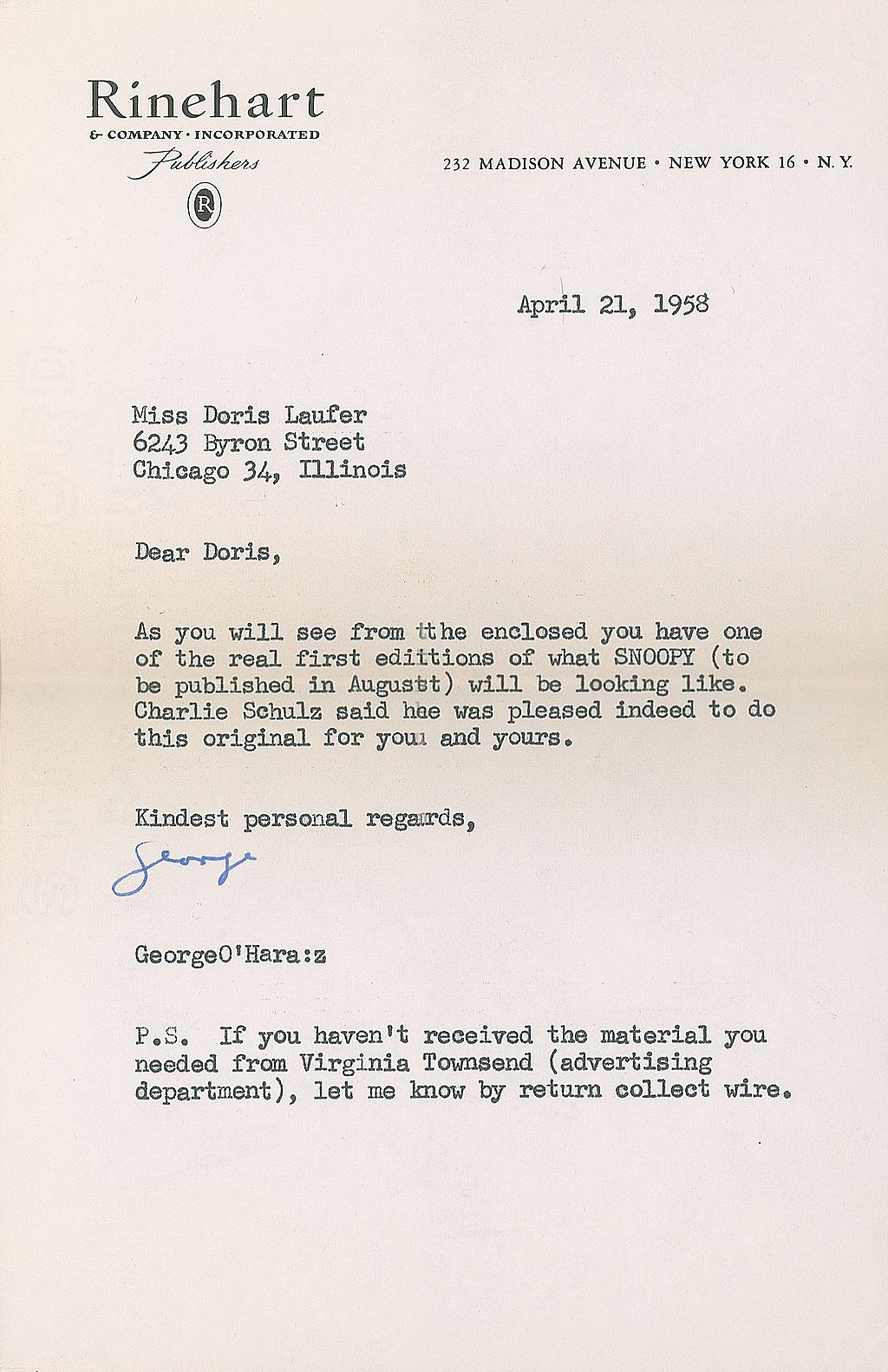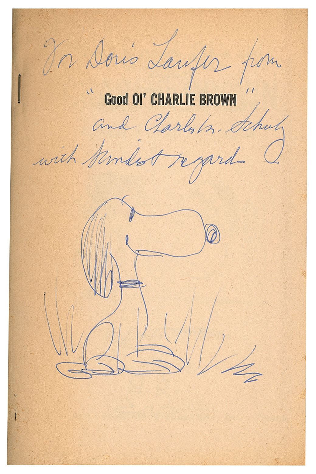 Signed book: Good Ol' Charlie Brown. First edition. NY: Rinehart, 1957. Softcover, 5.25 x 8. Wonderfully signed and inscribed on the half-title page in blue ballpoint, "For Doris Laufer, from '[Good Ol' Charlie Brown]' and Charles M. Schulz, with kindest regards," adding a superb early sketch of Snoopy below. In fine condition. Accompanied by a letter from the publisher, dated April 21, 1958, in part: "As you will see from the enclosed you have one of the real first editions of what SNOOPY (to be published in August) will be looking like. Charlie Schulz said he was pleased indeed to do this original for you and yours."