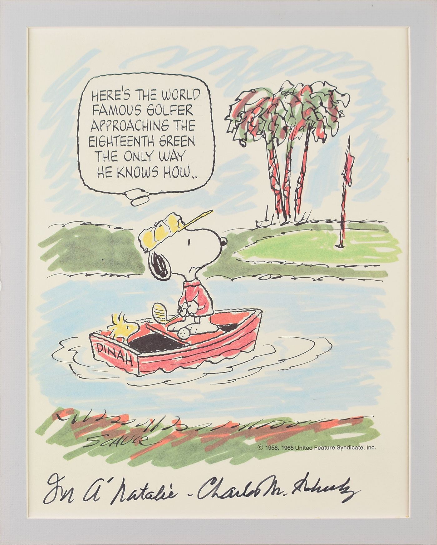 Humorous color 10.5 x 13.5 print showing Snoopy and Woodstock golfing from a small boat, published by United Features Syndicate in 1965, signed and inscribed in the lower border in black felt tip, "For A'Natalie, Charles M. Schulz." Matted to an overall size of 12 x 15. In fine condition.