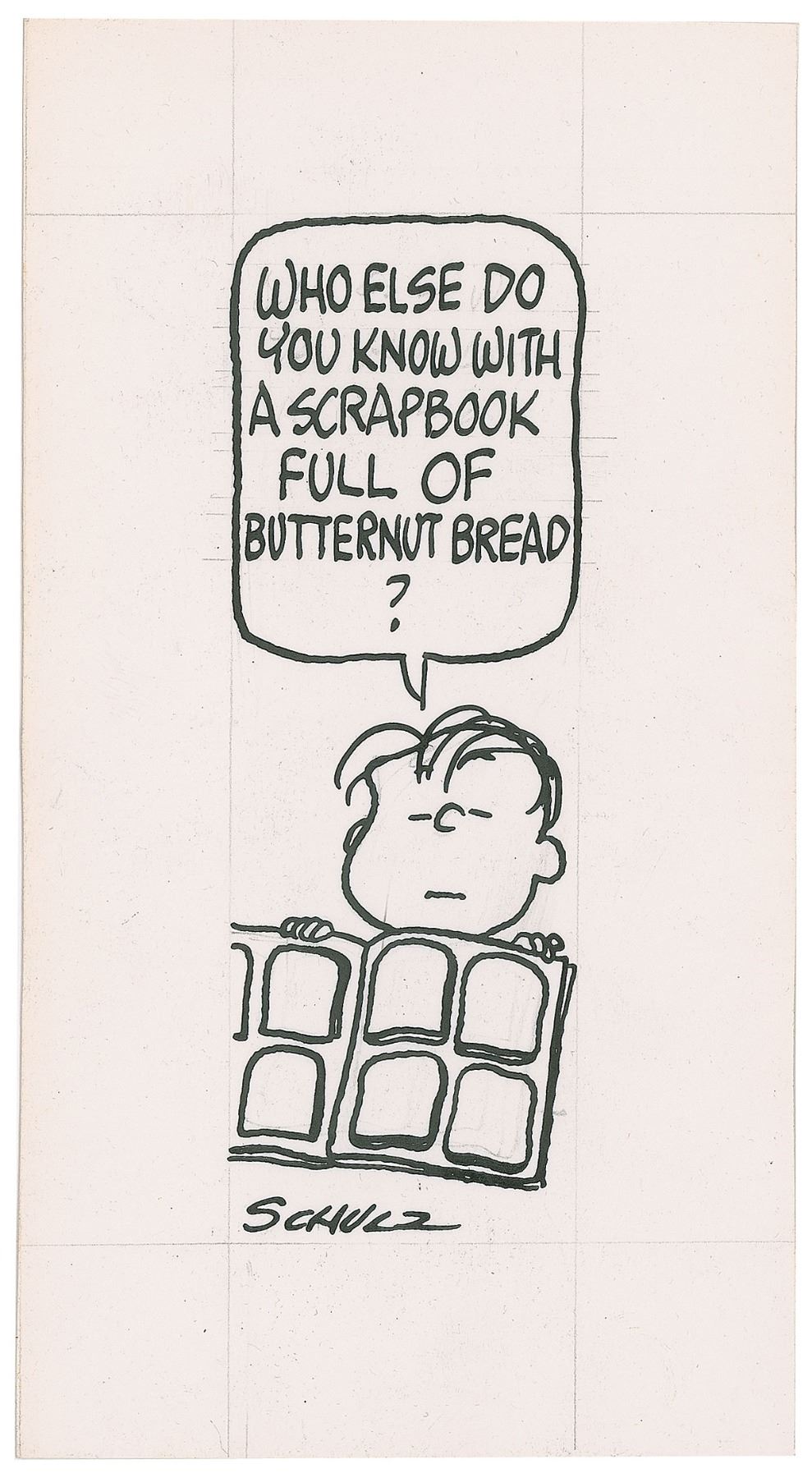 Original sketch of Linus van Pelt by Charles Schulz, depicting the youngster holding a scrapbook filled with slices of bread and asking "Who else do you know with a scrapbook full of butternut bread?," accomplished in ink and graphite on an off-white 4 x 7.25 cardstock sheet, which is signed at the bottom with his artist signature, "Schulz." In very fine condition. This drawing was originally done for an advertising agency in San Francisco around 1970, which handled an account for Butter Nut Bread.