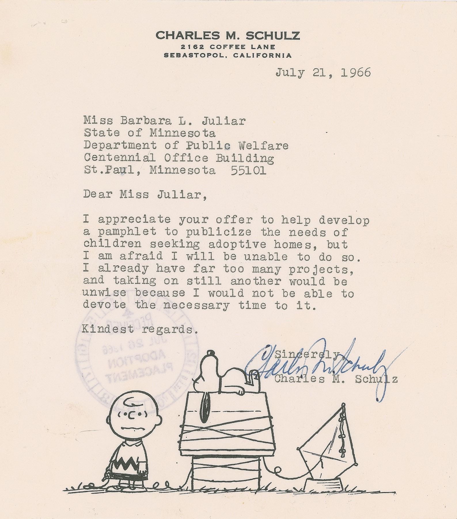 TLS signed “Charles M. Schulz,” one page, 6.25 x 7, personal letterhead, July 21, 1966. Letter to Barbara L. Juliar of the Minnesota Department of Welfare, in full: "I appreciate your offer to help develop a pamphlet to publicize the needs of children seeking adoptive homes, but I am afraid I will be unable to do so. I already have far too many projects, and taking on still another would be unwise because I would not be able to devote the necessary time to it." In fine condition, with staple holes to the upper left corner, and light show-through from a receipt acknowledgment stamp on the back.