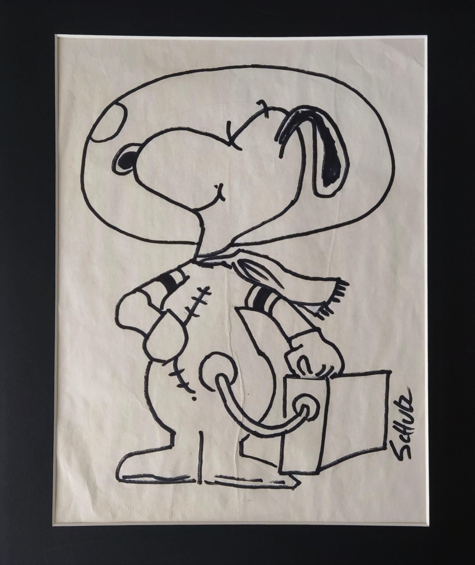 A piece of original art from one of the most revered cartoon artist of the 20th century, felt tip 9 3/4 x 7.5 inches of astronaut snoopy. Additionally signed by Charles Schulz. Mounted. The sketch has quite a few creases in it. It is supplied with a coa.