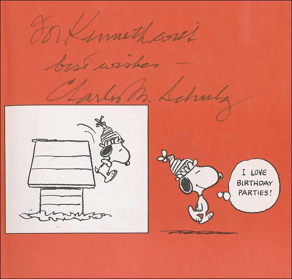 Signed book: Happy Birthday, Charlie Brown. First edition. NY: Random House, 1979. Hardcover, 9.75 x 9, 159 pages. Signed and inscribed on the opening page, “For Kenneth with best wishes—Charles M. Schulz.” In fine condition, with some light bending and corner dings and surface wear to covers.