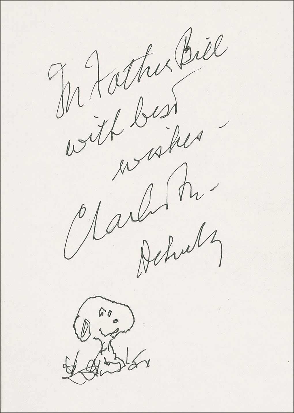 Program, 5 x 7, for a ball honoring Schulz’s receiving the Citizen Diplomacy Award on October 30, 1990, presented by the International Visitor’s Center, signed and inscribed in black ink on the inside back cover, “For Father Bill, with best wishes—Charles M. Schulz,” adding a small full-length sketch of Snoopy sitting in the grass. Inside front cover is signed and inscribed by Jehan Sadat. In fine condition.