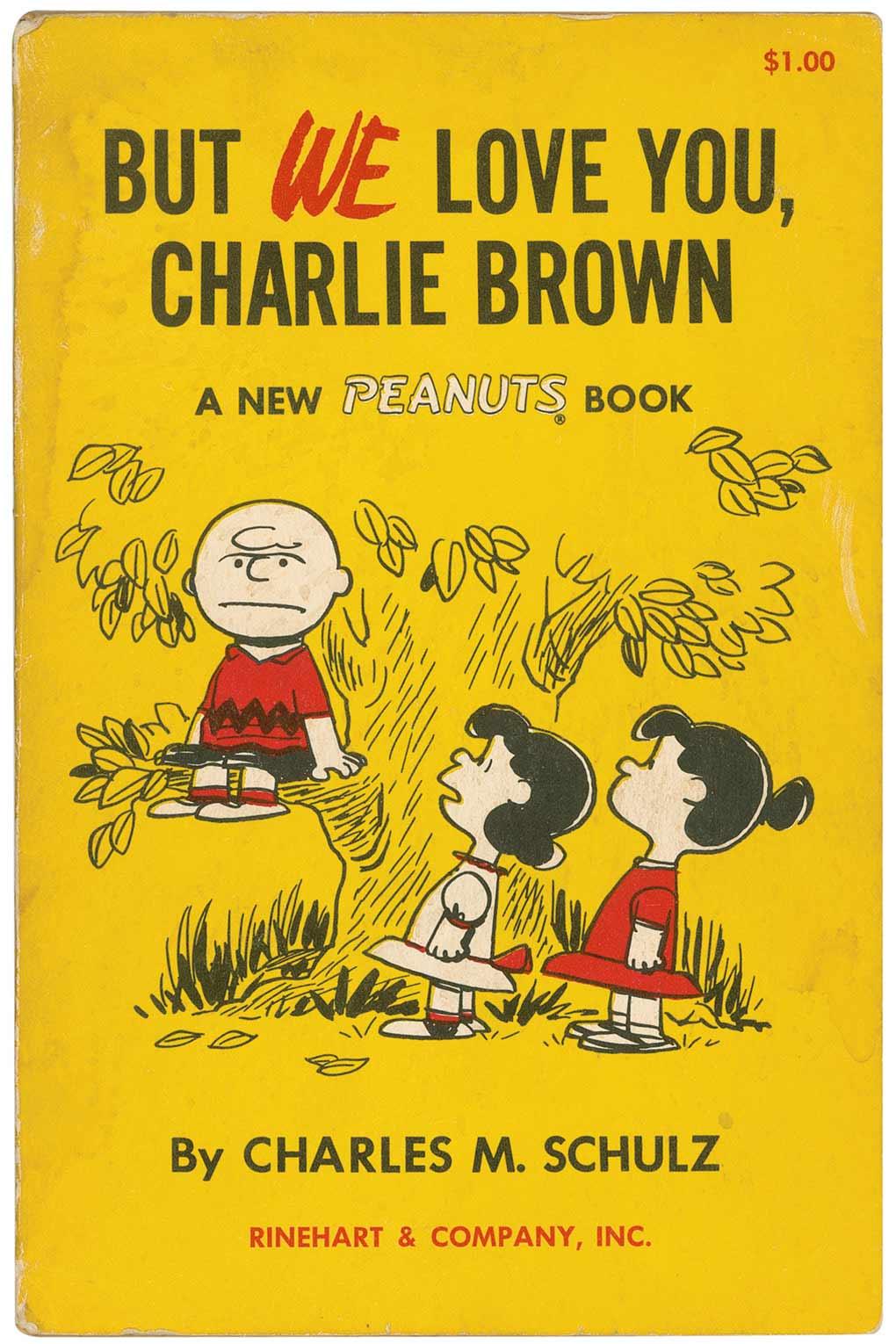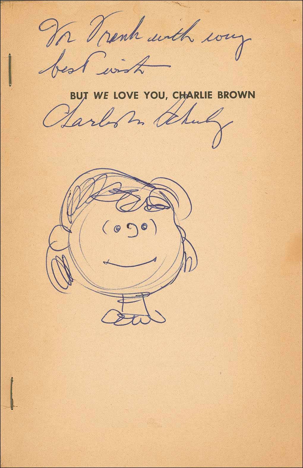 Signed book: But We Love You, Charlie Brown. Later printing. NY: Rinehart and Company, 1959. Softcover, 5.25 x 8. Signed and inscribed in ballpoint on the half-title page, “For Frank with every best wish, Charles M. Schulz,” adding a scarce vintage sketch of Lucy. Soiling, damp staining and toning to covers, and a mild shade of toning to interior pages, otherwise fine condition.
