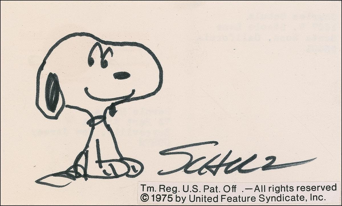 Original signed felt tip full-length sketch of Snoopy on an off-white 5.5 x 3.25 postcard. Accompanied by the original mailing envelope. In fine condition, with trademark information affixed to bottom of card and light show-through from typing on reverse. Pre-certified PSA/DNA and RRAuction COA.