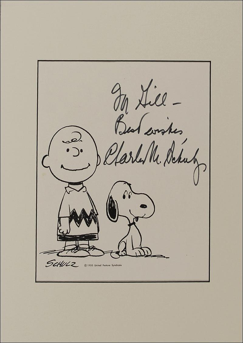 Printed signed and inscribed sketch of Charlie Brown and Snoopy on an off-white 8 x 9 sheet, signed and inscribed in black felt tip, “For Gill—Best wishes, Charles M. Schulz.” Matted to an overall size of 11 x 14. In very fine condition. RRAuction COA.