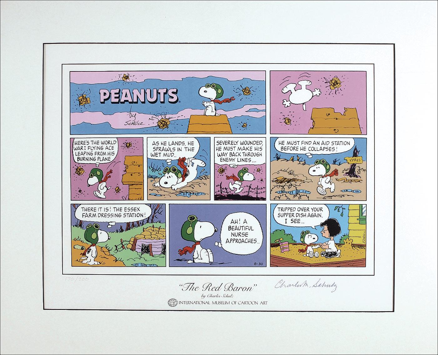 Limited edition color 18 x 13.5 print entitled “The Red Baron,” #170/200, depicting a nine-panel Peanuts sunday strip of Snoopy as the Red Baron, signed in blue ballpoint. Matted to an overall size of 23 x 18.5. In very fine condition. RRAuction COA.
