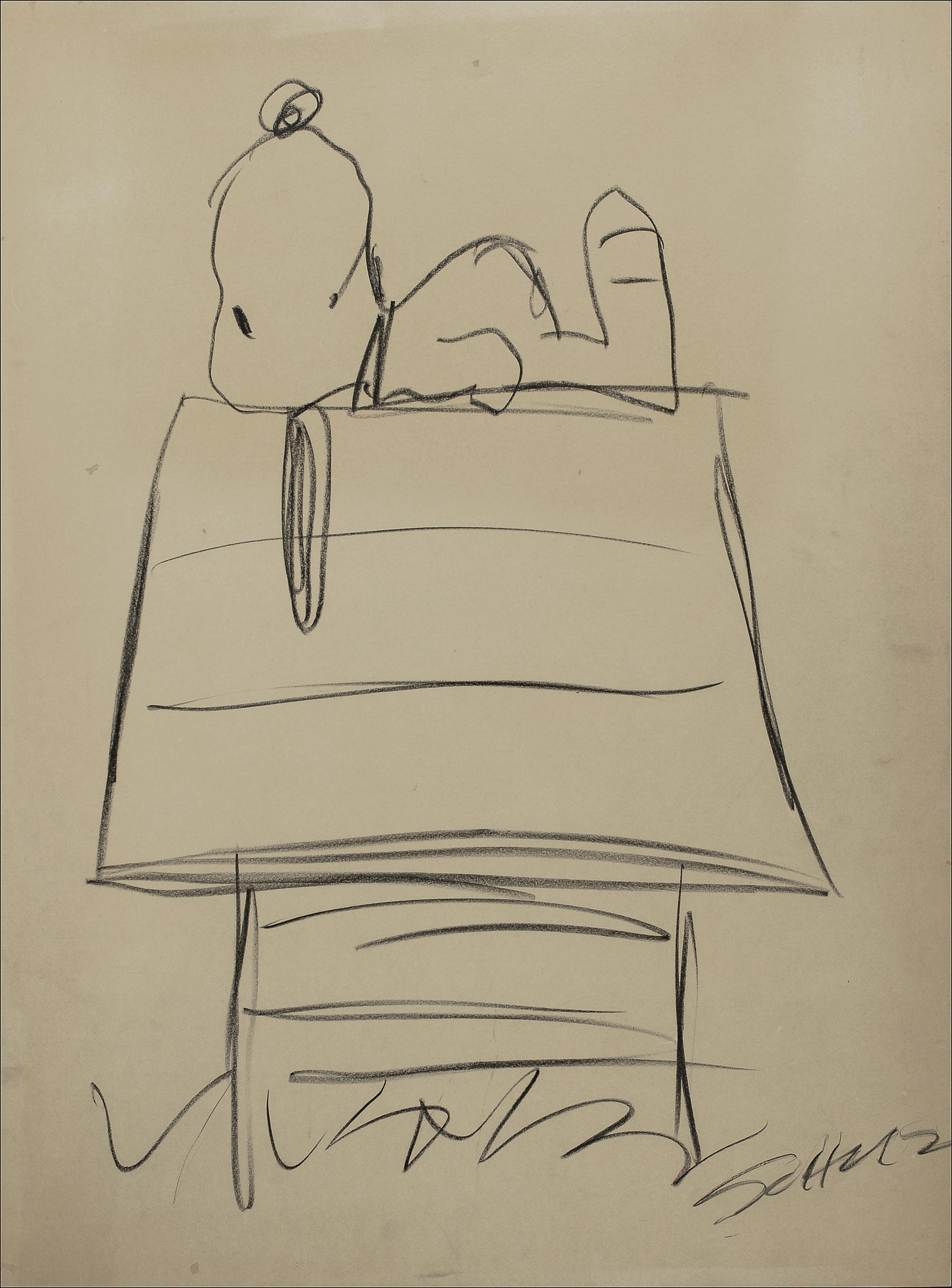 Gigantic original signed crayon sketch of Snoopy lying atop his dog house on an off-white 23 x 31 board, signed at the bottom, “Schulz.” A label affixed to reverse indicates that this unique piece was “drawn before the Hollywood Radio and Television Society, April 26, 1977.” Board has a small built in raised frame on the reverse measuring 19 x 27. Scattered light irregular and inoffensive toning, including a light block over Snoopy, and a strip down the left side, and a few trivial surface chips, none affecting sketch, otherwise fine condition. Simply amazing: you will likely never see another Snoopy sketch like this! Oversized.