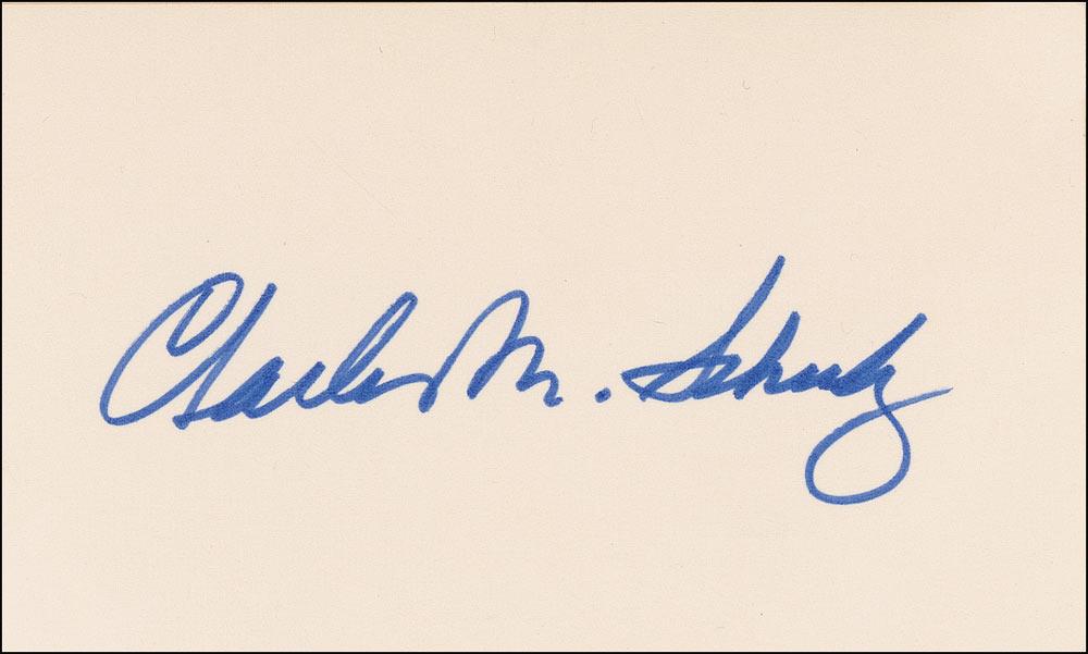 Bold blue felt tip signature, “Charles M. Schulz,” on a 5 x 3 card. In fine condition.