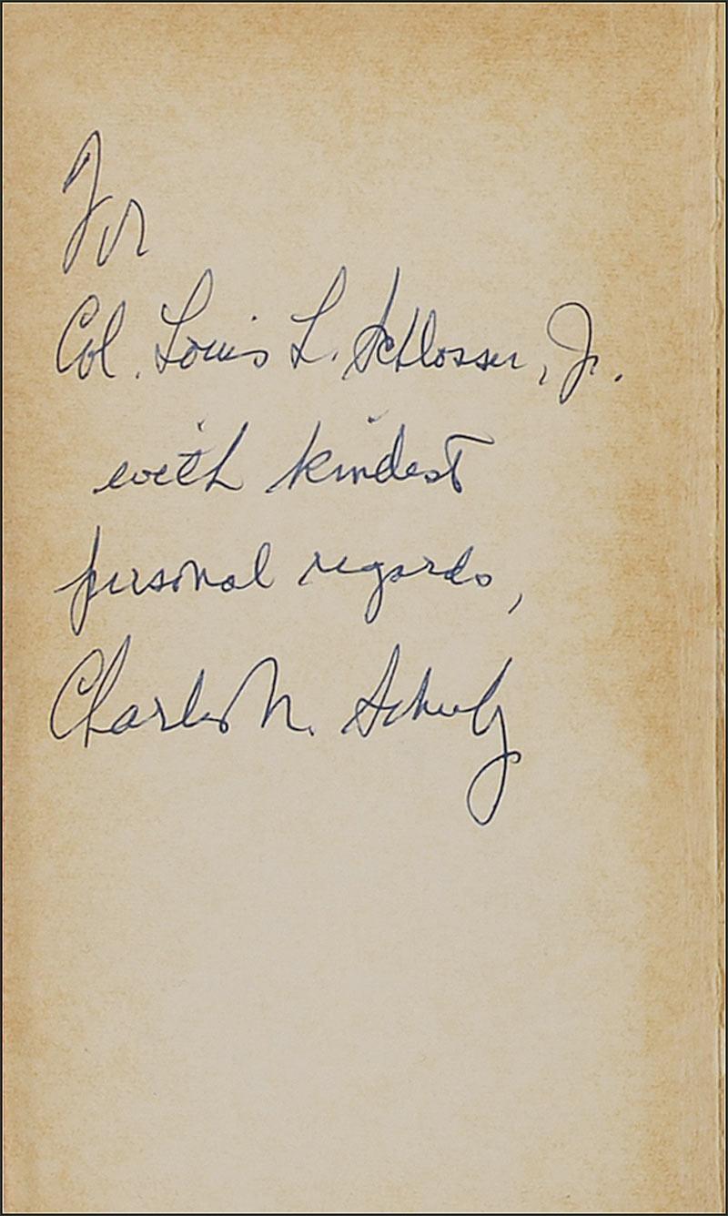 Signed book: The Wonderful World of Peanuts. Later printing. Connecticut: Fawcett Crest, 1967. Paperback, 4.25 x 7.25. Signed and inscribed on the inside front cover, “For Col. Louis B. Schlosser, Jr., with kindest personal regards, Charles M. Schulz.” In very good condition, with toning to signed cover and inside pages, adhesive residue to front cover, signed owner’s bookplate affixed inside, and some mild cover creasing.