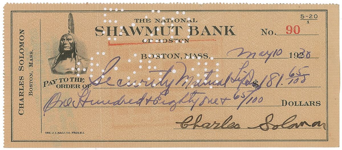 Jewish-Russian mob boss (1884–1933) who controlled Boston's bootlegging, narcotics, and illegal gambling during Prohibition. Personal check, 6.25 x 2.75, filled out in another hand and signed by Solomon, payable to Security Mutual Life Ins. for $181.65, May 10, 1930. In fine condition.