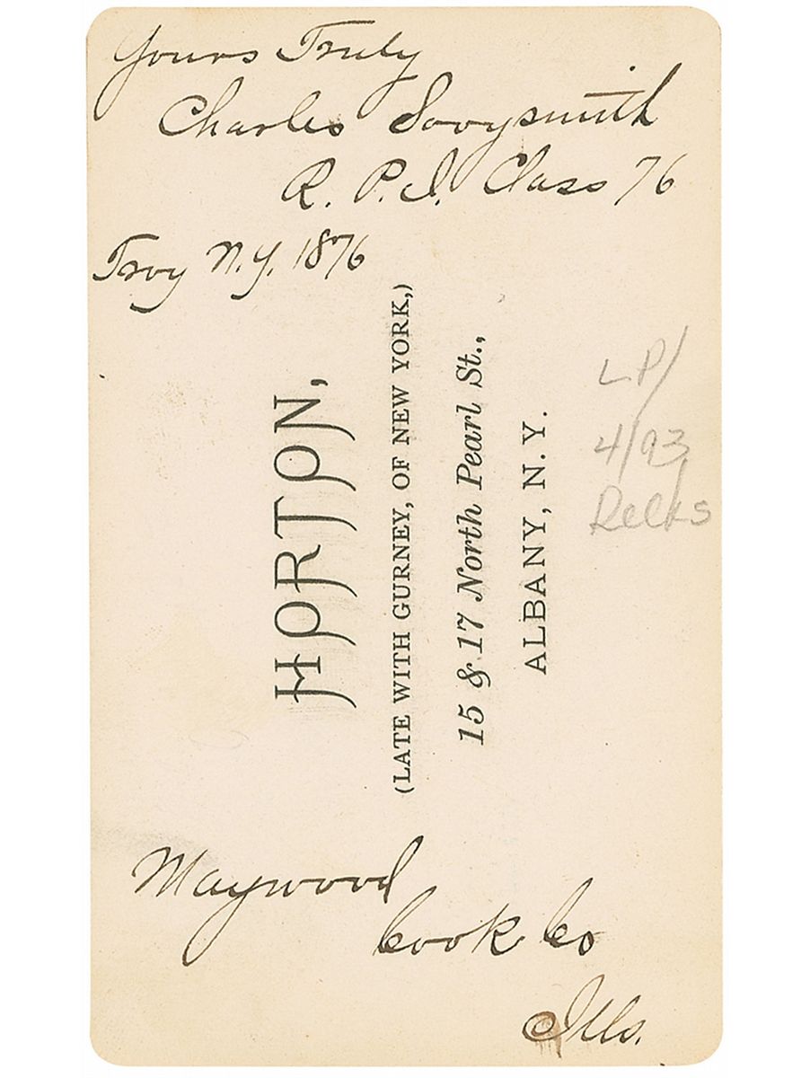 Civil engineer who introduced the ‘freezing’ process of excavation in big building projects, and designed the foundation for the Empire Building in Manhattan. Choice original 2.25 x 4 carte-de-visite photo by Horton of Philadelphia, signed on the reverse in black ink, “Yours truly, Charles Sooysmith, R. P. I. Class 76, Troy N.Y. 1876, Maywood, Cook Co. Ills.” In fine condition, with a small pencil notation to reverse.