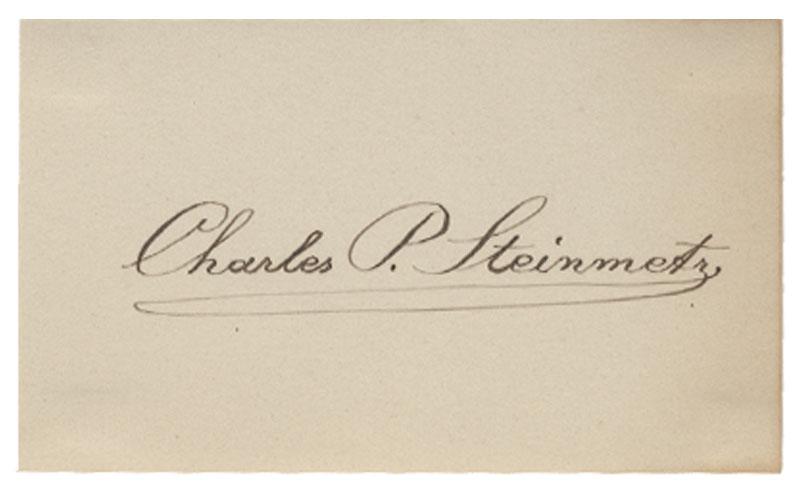 CHARLES P. STEINMETZ, (1865-1923). Mathematician and engineer. Steinmetz is best known for his development of the theory of alternating currents and for his experiments with artificially-created lightning. He established his name in the American scientific community in 1892, preparing an analysis of hysteresis loss, a magnetic effect peculiar to alternating current. A true scientific genius. Signed card 4" x 2 1/2". "Charles P. Steinmetz". Accompanied by an interesting contemporaneous type note indicating that "This is probably the last autograph of Charles Steinmetz as the envelope was postmarked...and he died the following day. Accompanied by the postmark cut from the original envelope in which the card was sent. An interesting assemblage. Excellent.