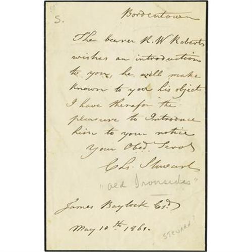 <B>Charles Stewart, Captain of the U.S.S. Constitution Autograph Letter Signed</B></I> “<I>C. L. Stewart</B></I>”. One page, 4.75” x 7.25”, Bordentown, May 10, 1861, to James Blaylock, Philadelphia. The former captain and naval hero of the War of 1812 writes a letter of introduction which reads in part: “<I>The bearer R. W. Roberts wishes an introduction to you, he will make known to you his object I have therefor sic the pleasure to Introduce him to your notice.</B></I>” Slightly soiled at the folds, else fine. <I>From the collection of Henry E. Luhrs.</B></I><BR><BR><b>Shipping:</b> Flat Material, Small (<a target="_blank" href="http://www.heritageauctions.com/common/shipping.php">view shipping information</a>)