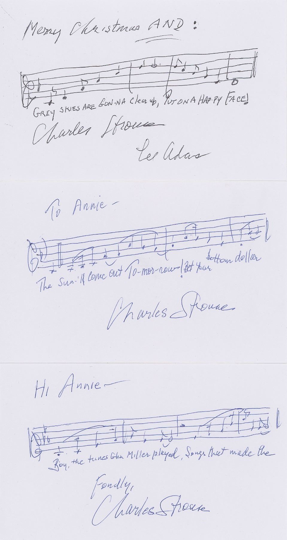 American composer and lyricist (born 1928) best known for writing the music to such Broadway musicals as Bye Bye Birdie and Annie. Three AMQSs penned by composer and lyricist Charles Strouse on individual off-white 8 x 5 sheets, with each sheet featuring three or four bars of music as well as lyrics from popular songs like 'Put on a Happy Face' ("Grey skies are gon-na clear up, Put on a happy face"), 'Tomorrow' ("The sun–'ll come out To–mor–row!