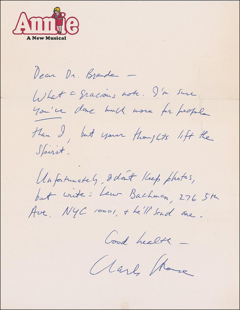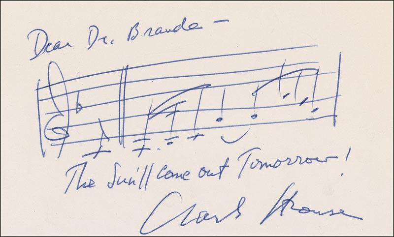 Two items: An AMQS on an off-white 5 x 3 card, with Strouse penning two bars of music and lyrics to “The Sun’ll Come Out Tomorrow,” signed and inscribed to Dr. Brande; and a one-page ALS on Annie letterhead to the quote’s recipient forwarding an address where a signed photo can be obtained. In very fine condition. Accompanied by the original mailing envelope. RRAuction COA.